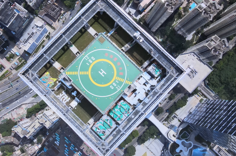 大廈頂部設置高端停機坪,為企業定制專屬航線,滿足消防救災、貴賓接送、醫療救護、旅游觀光等多方需求。項目整體規劃設計突顯山水延伸與融合的理念,對標國際綠色建筑標準,堅持人與自然和諧相處,榮膺2022年度廣廈獎。