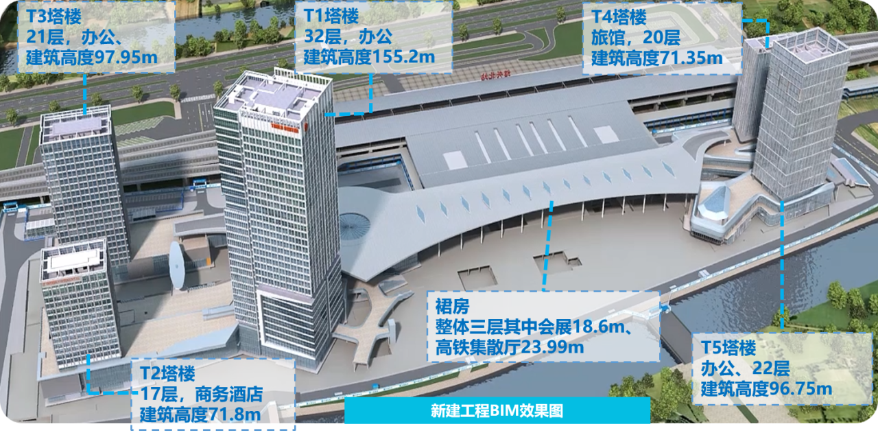 該項目是浙江省重點工程、紹興市一號工程,位于紹興北站周邊區域,北鄰高鐵站房、南靠嘉會河,總建筑面積約55萬平方米,其中地下三層(局部四層)、地下建筑面積達22萬平方米,地下大空間結構復雜,是集商務辦公、科創研發、星級酒店、商業零售等多重功能于一體的智慧型城市交通綜合體。