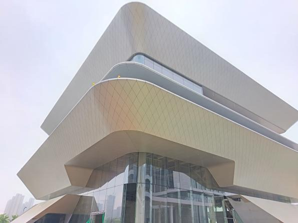 項(xiàng)目綜合樓外立面為“山峰”造型設(shè)計(jì),包含豎明橫隱玻璃幕墻、全玻幕墻、開縫鋁板幕墻、玻璃欄板4種幕墻系統(tǒng),采用5系進(jìn)口陽極氧化鋁板,涂層厚度超15μm,具有極強(qiáng)耐腐蝕性,鋁板超20年不褪色;外立面菱形蜂窩板塊合計(jì)10228塊,四個轉(zhuǎn)角為雙曲蜂窩板,雙曲作業(yè)面超30%,以直線型、出挑、倒圓角等設(shè)計(jì)手法,塑造動感、理性、簡約的建筑造型。