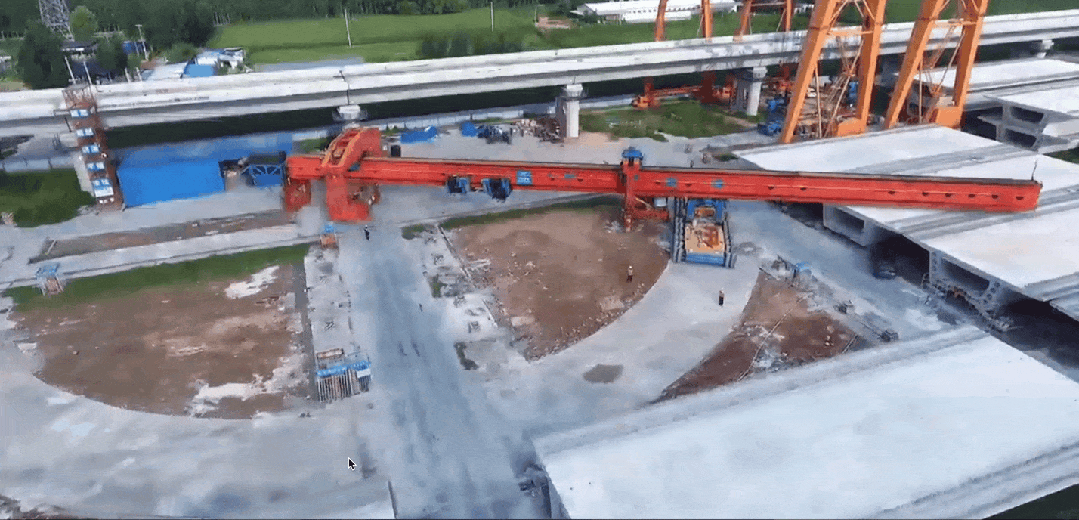 在開啟小里程方向架梁前,由于架橋機設備長、重量大,為單向作業機械,無法如汽車般倒車后退,需要從橋面移至地面進行調頭作業,涉及施工程序復雜、過程控制要求高。項目團隊精心策劃,合理安排梁場施工任務,避免架橋機撞擊梁體,做好場地測量、換填平整與硬化工作,確保調頭作業面充足、承載力足夠。2臺大型跨線龍門吊將架橋機、運梁車吊裝至橋下 ,隨后運梁車馱運架橋機至調頭通道,進行180度轉彎調頭。待架橋機完美轉身,兩臺大型提梁機啟動運轉,經過近兩小時的穩升緩落,將其精準放落于橋面,至此項目正式進入小里程方向架梁階段。