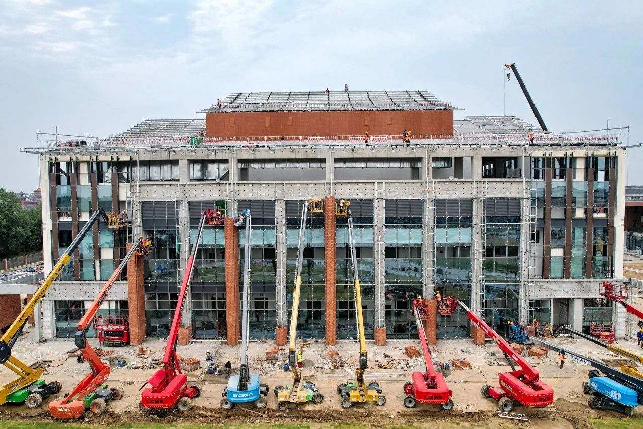 項目表演實訓樓內設2個專業演播廳,可容納2180人教學表演,結構單層高度超30米、跨度超40米且包含大量勁性構件、鋼結構網架,項目編寫超高超長雙層梁工程施工工法,成功破解此類工程高空作業、鋼筋布置、撓度控制、結構穩定等系列難題。