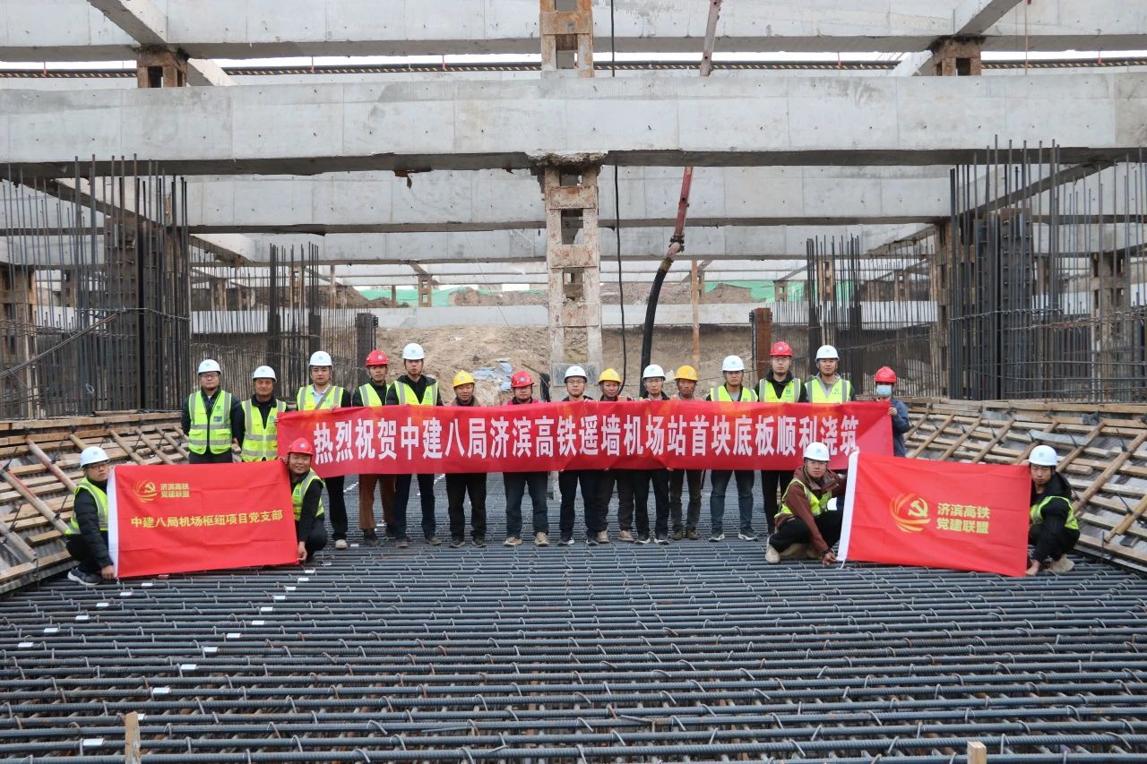 11月22日,中建八局承建的濟濱高鐵遙墻機場站項目歷經30小時奮戰,完成首塊底板共計2800立方米混凝土澆筑,標志著項目進入主體結構施工階段。