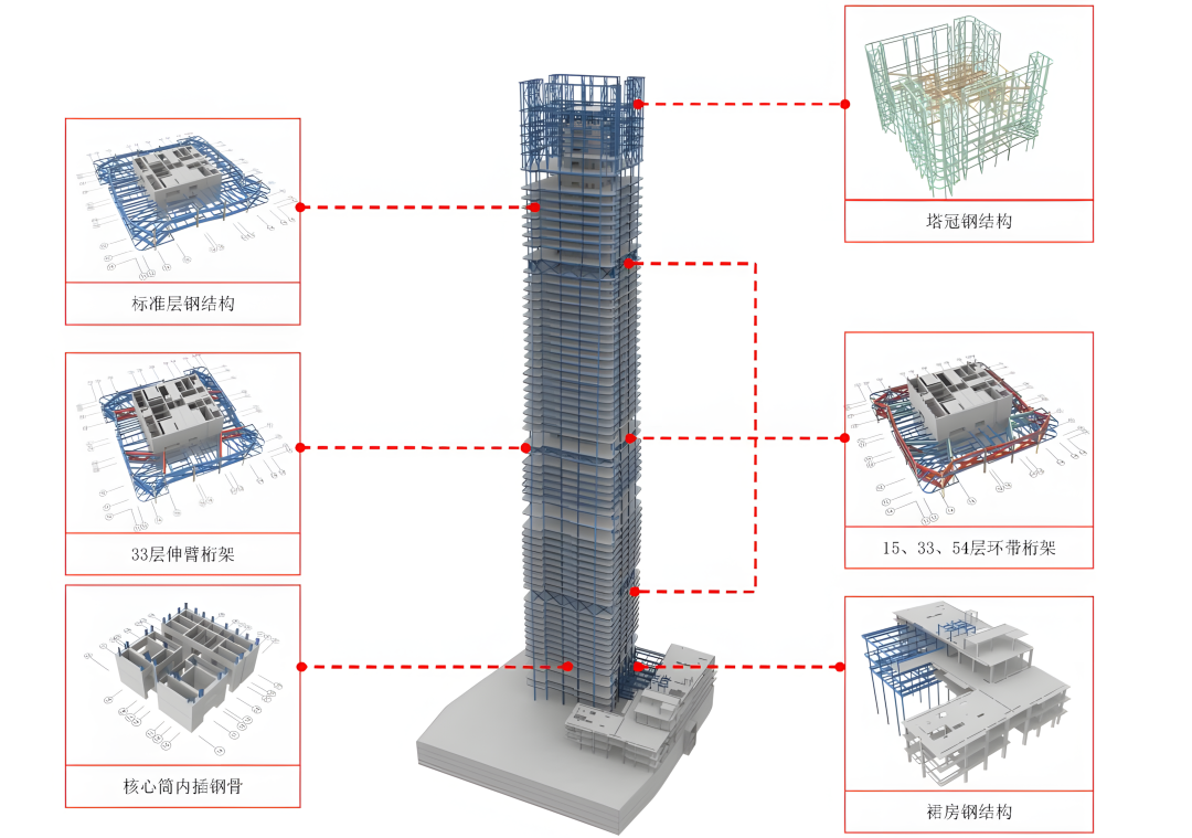項目鋼結構設計涵蓋伸臂桁架、環帶桁架超高塔冠等多種復雜鋼結構,總用鋼量達2萬余噸,核心筒采用了超高層建筑中罕見的自下而上單向縮失(逐漸縮小)體系,非對稱性核心筒結構呈現偏心狀態,對核心筒垂直度控制難度大,項目在全生命周期應用BIM技術,利用三維掃描儀掃描核心筒數據,提高鋼結構安裝一次成優率,節省工期90余天。