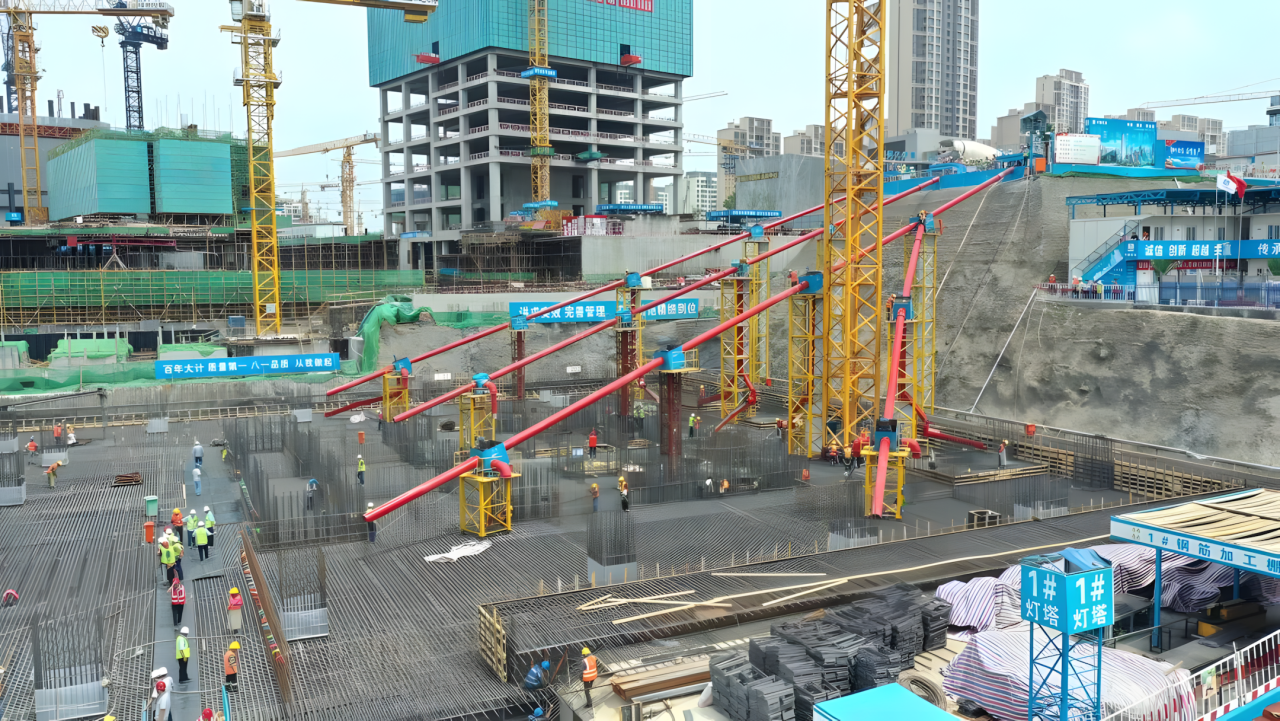 項目基礎筏板最大厚度7.7米,筏板混凝土總方量超1萬立方米,項目創新研發“全過程無間歇溜管法澆筑技術”,120輛攪拌車不間斷作業14小時,完成1萬立方米混凝土澆筑,刷新當時山東省混凝土澆筑最快速度,技術成果達到國際領先水平。