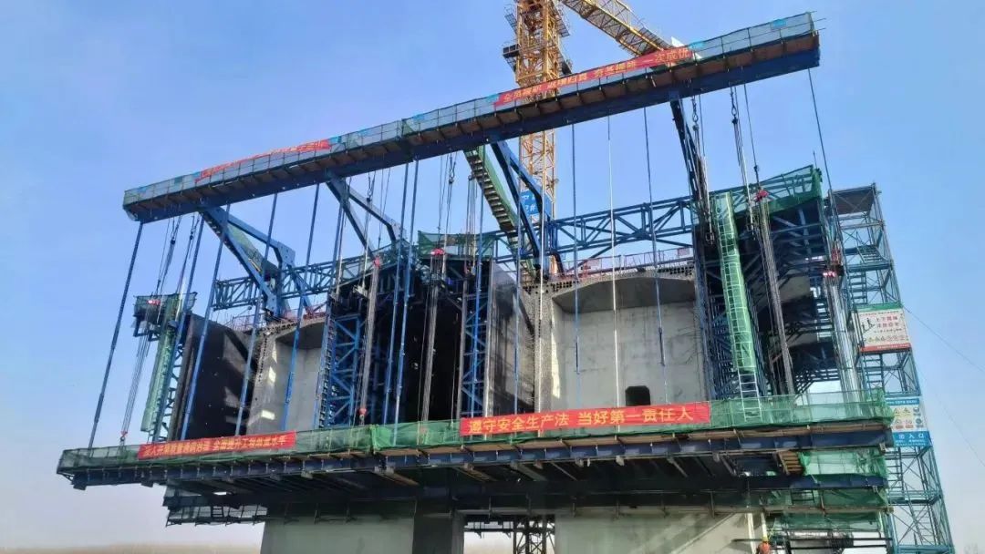徒駭河特大橋是項目施工的重難點,全長1248.5米,共9聯,單幅橋寬16.5米,主跨長358.5米,最大跨徑165米,主橋采用單箱單室變截面預應力混凝土連續梁結構形式,是徒駭河跨徑最大連續剛構現澆梁。