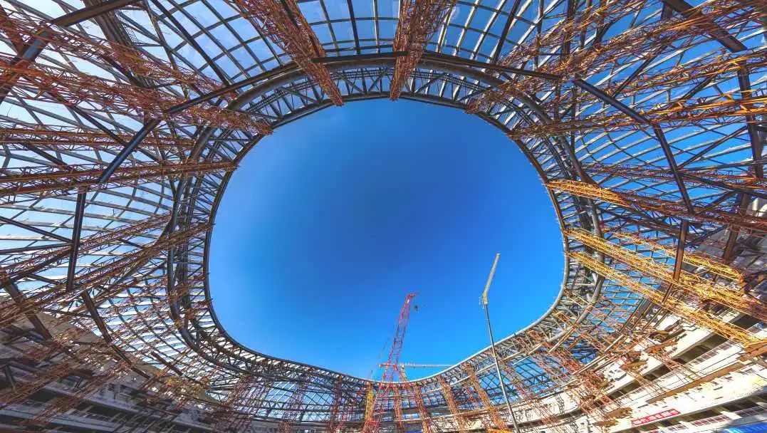 近日,中建八一承建的黃河體育中心專業足球場項目全面完成屋蓋鋼結構施工,“黃河明珠”成功戴上1.6萬噸“鋼鐵巨冠”,標志著項目攻克國內體育場館懸挑長度之最,正式進入索、膜結構及金屬屋面施工階段。