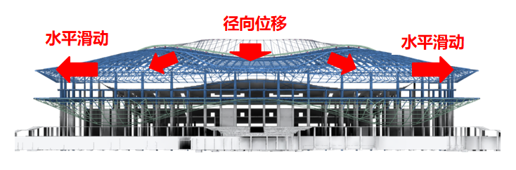 項目屋蓋鋼結構通過滑動支座與下部36根排架柱焊接固定,卸載過程支座會產生水平滑動,對卸載精度將產生影響。項目聯合重慶大學科研團隊研發“正向施工過程分析和反向迭代計算”,為鋼結構施工預變形分析提供算法支撐,成功將滑動支座安裝精度控制在±30mm內。