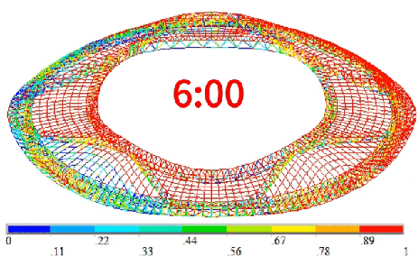 項目組建技術攻關團隊,確定“內外環正反序”同步卸載方案,屋蓋鋼結構外環桁架卸載變形量小,采取同步割除支撐胎架方式進行卸載,內環及星型桁架整體變形量大,采用“超大型構件液壓同步卸載技術”,保證整體卸載過程平穩、高效進行。