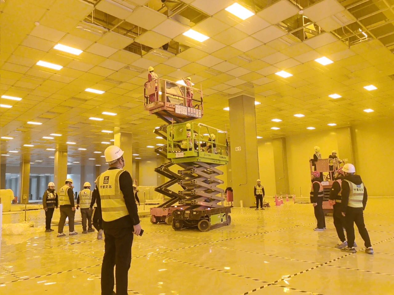 項(xiàng)目存在大量高空作業(yè),現(xiàn)場同時(shí)應(yīng)用近200臺登高車,高空作業(yè)安全管控難度較高,項(xiàng)目配置20名安全員全天候巡查,嚴(yán)格落實(shí)佩戴雙掛鉤安全帶,增設(shè)生命繩、鋪設(shè)PE防滑墊等舉措,為現(xiàn)場作業(yè)安全保駕護(hù)航。