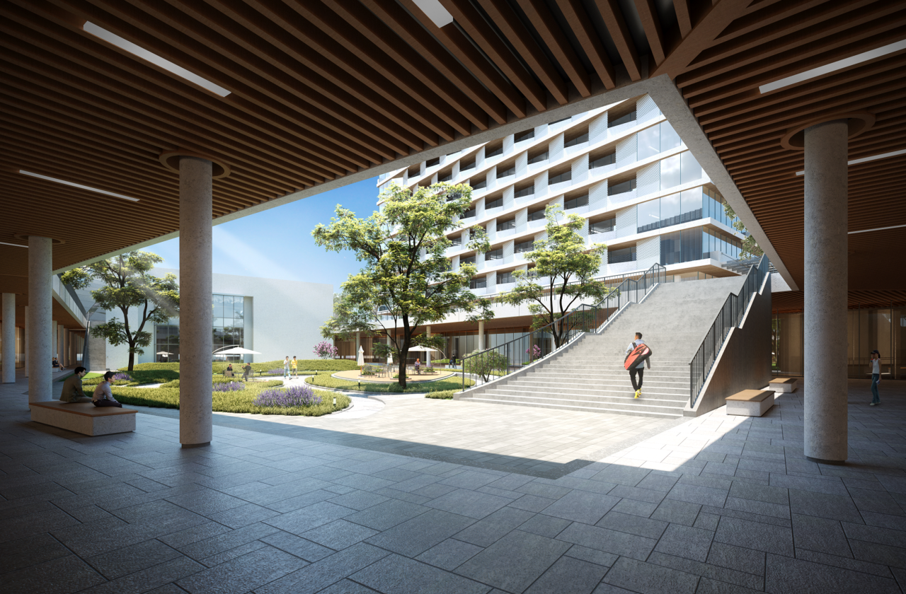 項(xiàng)目在“大平臺(tái)”中部打造下沉庭院,將首層訓(xùn)練館降低到與負(fù)一層平齊,使內(nèi)部場地和城市道路天然隔開,為運(yùn)動(dòng)員創(chuàng)造安靜私密的內(nèi)向性空間,且降低了龐大體量對(duì)臨近道路造成的壓迫感。