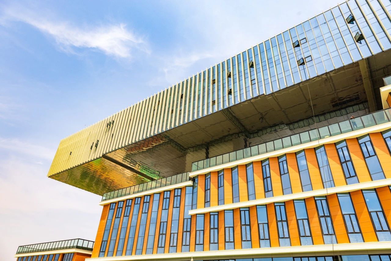 項目由6根立柱式核心筒及大量框架托舉起頂部的“鋼鐵頂冠”,呈現出“平行世界”的設計理念,其中大噸位、大跨度整體提升鋼連廊最大懸挑44米,整體提升高度30米,是濟南市起步區首個跨度超90米的高空鋼桁架結構。