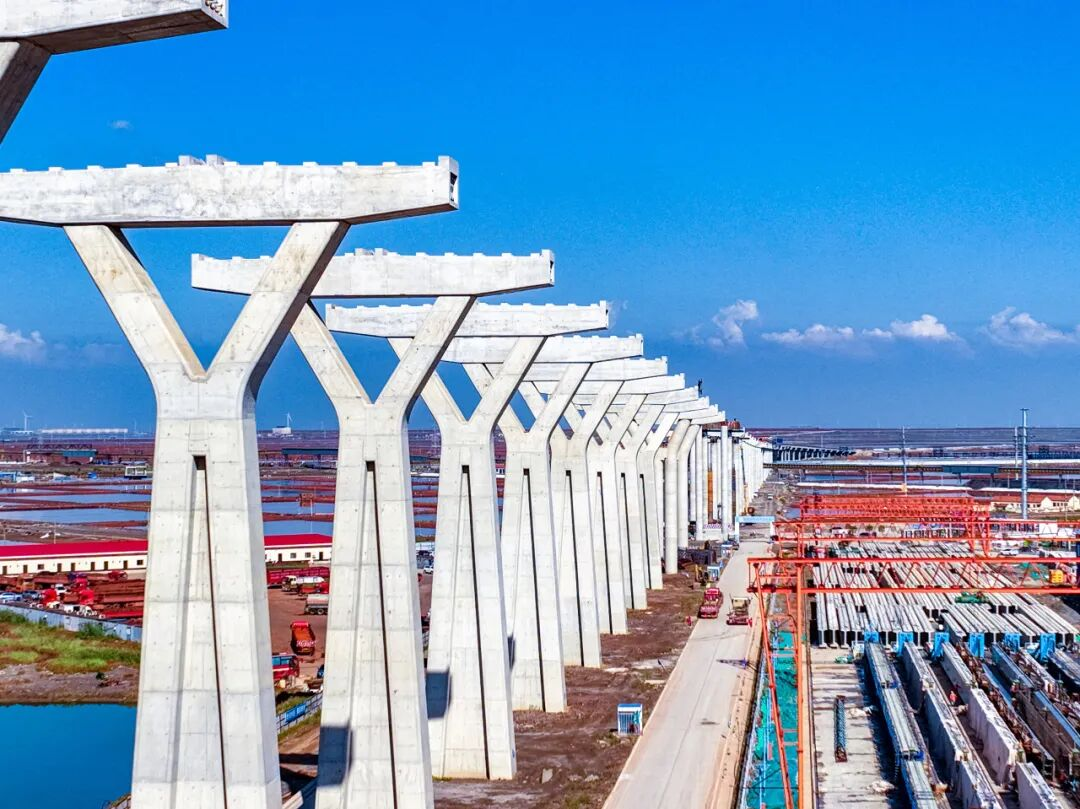 測量期間,項目建設者參考衛星地圖,背著充氣皮筏和測量設備,步行穿過萬畝灘涂,實現各測量點精準定位。制定“臨時圍堰+永久圍堰”施工方案,隔離施工區域海水開展路基施工,將永久圍堰作為臨時道路,高峰時上百輛工程機械“入海作業”,按照“先成段、再成線、連成片”的方式,2個月實現1.6萬米圍堰貫通。