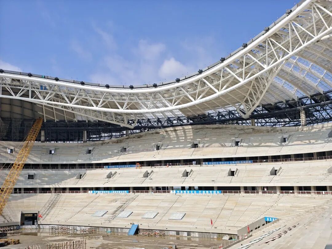后續工程穩步推進 膜結構施工將啟。目前,項目屋蓋鋼結構已全部施工完成,屋面與幕墻結構正同步推進,建筑輪廓如同 “黃河明珠” 般在黃河之畔熠熠生輝。下一步,施工團隊將在看臺上安裝人體工學觀賽座椅,進一步優化觀賽舒適度。