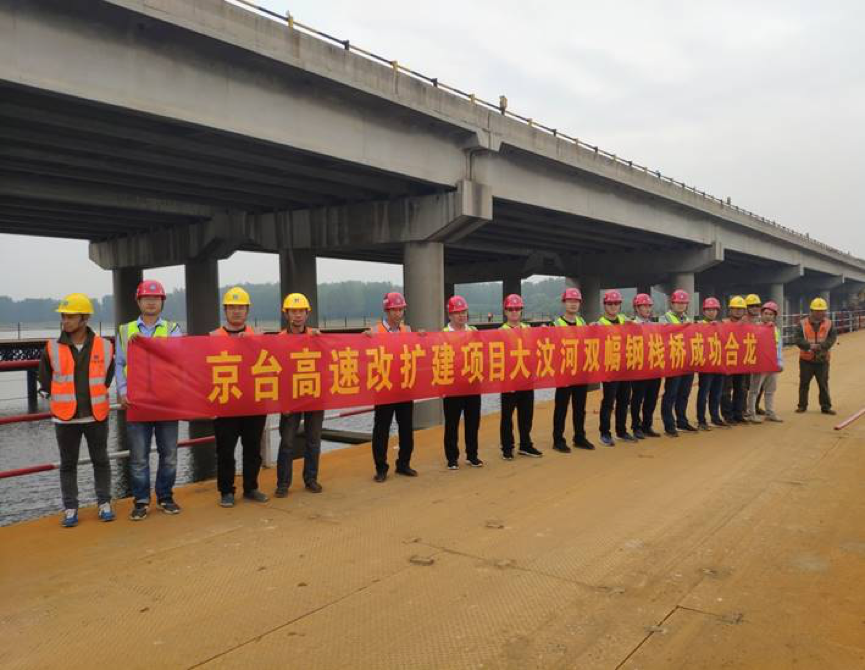 公司京臺高速項目大汶河特大橋雙幅鋼棧橋順利合龍