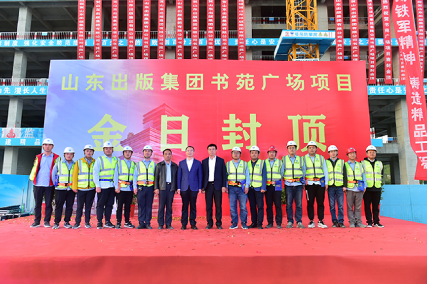 10月14日,一公司山東出版集團圖書展示樓項目喜迎封頂。 山東新源文化置業有限公司董事長李濤、總經理孫明,濟南建設監理有限公司董事長林峯,山東意匠建筑設計有限公司副院長劉祥春,一公司黨委書記、董事長董文祥,濟南公司總經理霍文濤共同出席了封頂儀式。