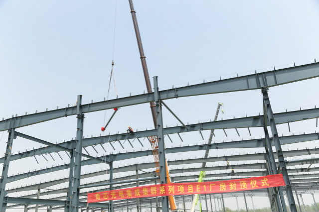 4月18日,奇芯光電項目E1廠房舉行了鋼結構封頂儀式。