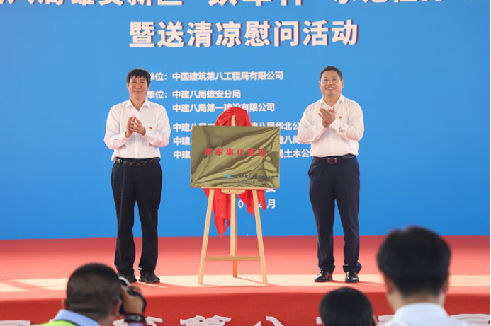 8月12日早晨7:30,中建八局雄安新區“鐵軍杯”示范性勞動競賽暨送清涼慰問活動,在雄安站樞紐片區市政道路、綜合管廊、排水管網系統(一期)工程一標段項目舉辦。本次勞動競賽受到雄安新區黨工委、管委會和雄安集團的高度重視。雄安新區黨工委副書記、管委會常務副主任、中國雄安集團有限公司黨委書記、董事長田金昌,雄安集團有限公司黨委副書記、總經理劉中林,雄安新區黨工委委員、管委會副主任梁遠,雄安新區建設指揮部副總指揮、昝崗片區指揮部指揮長張躍峰等39人應邀出席活動。